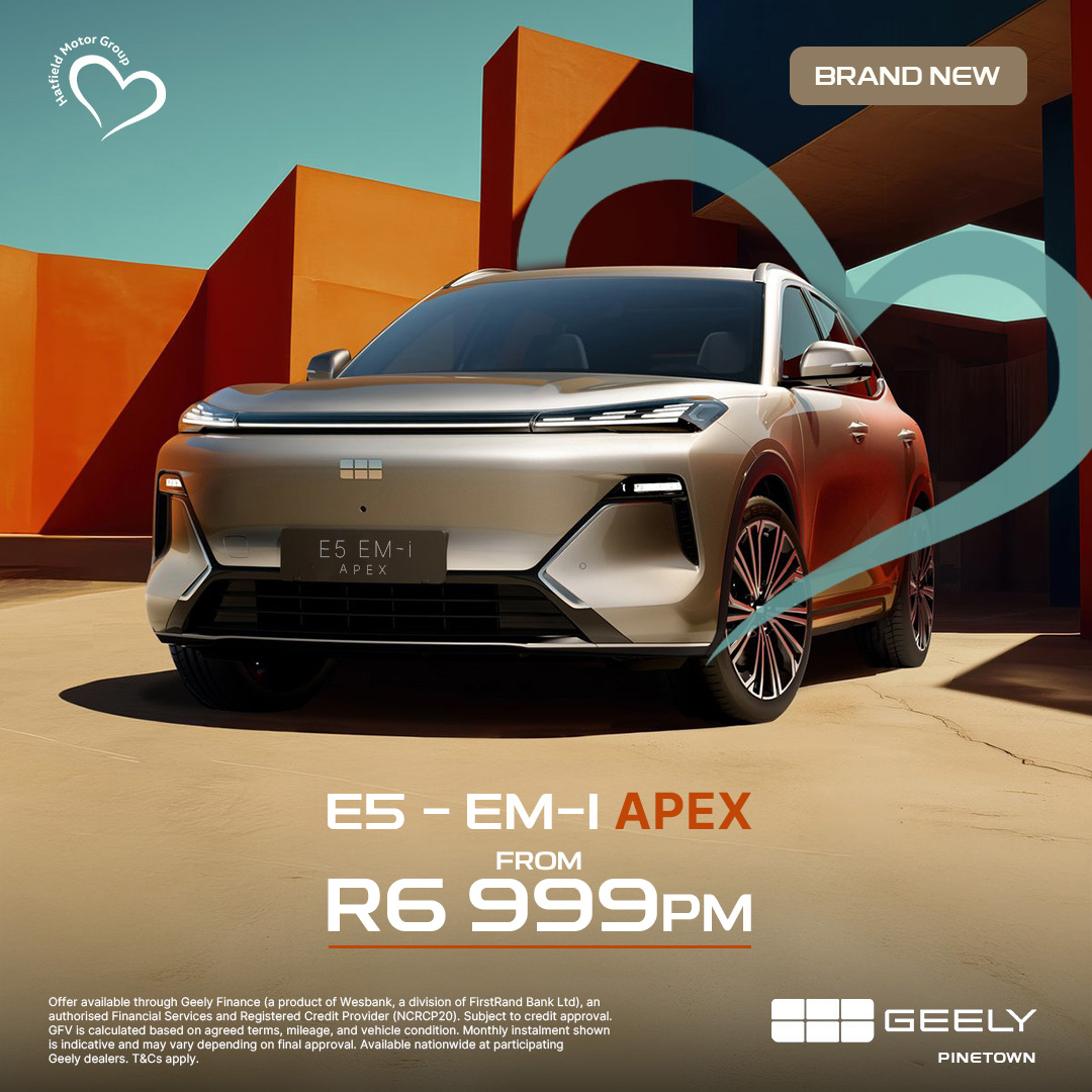 Offer available through Geely Finance (a product of Wesbank, a division of FirstRand Bank Ltd), an authorised Financial Services and Registered Credit Provider (NCRCP20). Subject to credit approval. GFV is calculated based on agreed terms, mileage, and vehicle condition. Monthly instalment shown is indicative and may vary depending on final approval. Available nationwide at participating Geely dealers. T&Cs apply.