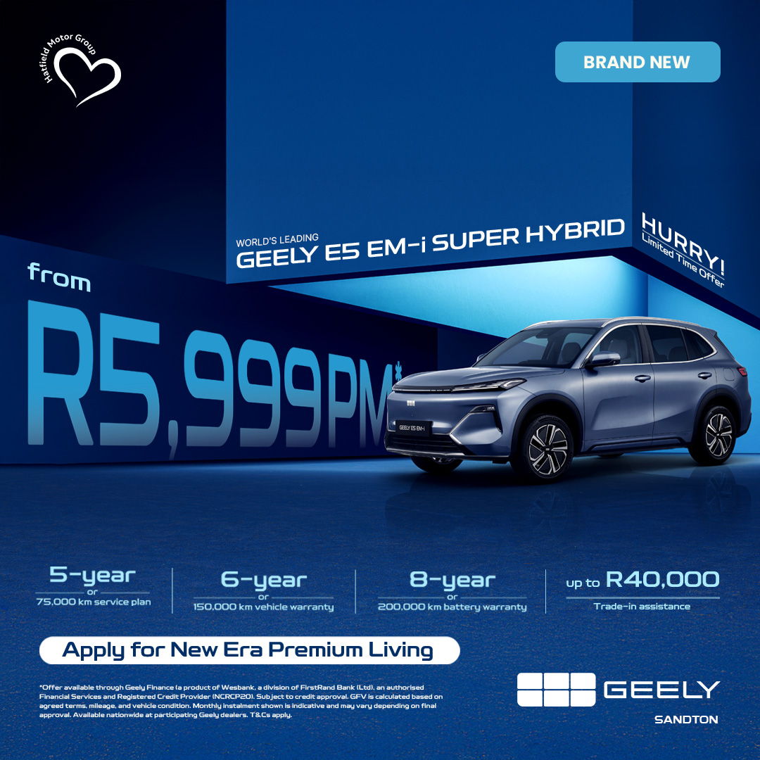 *Offer available through Geely Finance a product of Wesbank, a division of FirstRand Bank (Ltd), an authorised Financial Services and Registered Credit Provider (NCRCP20). Subject to credit approval. GFV is calculated based on agreed terms, mileage, and vehicle condition. Monthly instalment shown is indicative and may vary depending on final approval. Available nationwide at participating Geely dealers. T&Cs apply.
